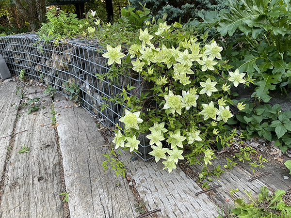 ![]() ▲ガビオン(かご石)に誘引したクレマチス(白万重) |
