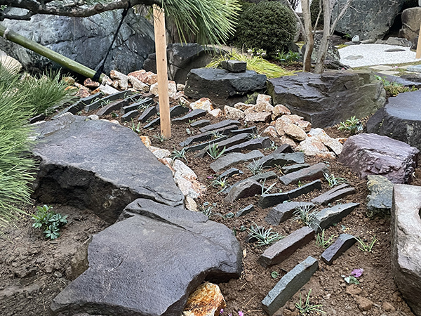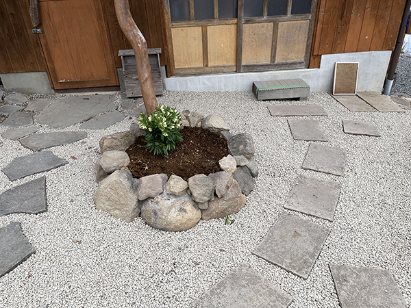 ![]() ▲茶室への導線を透水性舗装の小径にして歩きやすく ![]() ▲先代が集めた石も庭の一部に ![]() ▲松の下のクリスマスローズ |