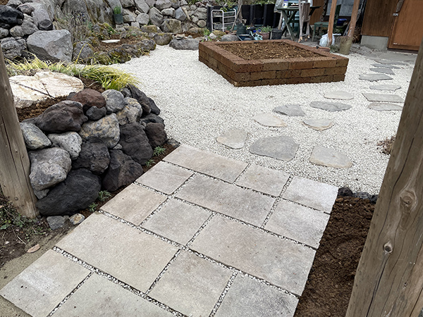 ![]() ▲フラットで歩きやすい通路へリニューアル ![]() ▲イタリア切り石との相性も良い ![]() ▲既存の切り石等も再利用して通路のアクセントに |