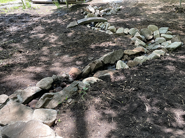 ▲使いやすい2口蛇口付き枕木立水栓と、石囲い水受け |