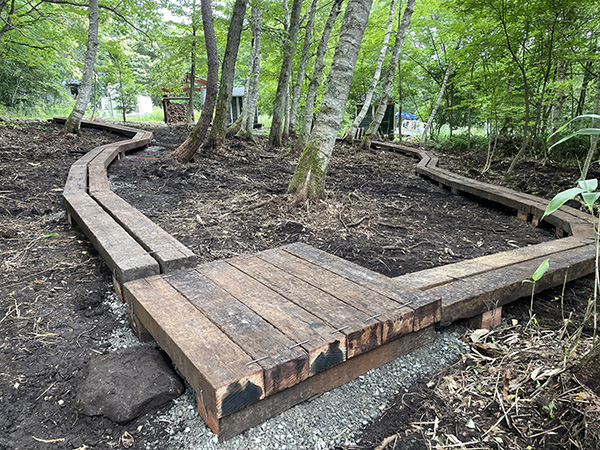 | 石囲いの炉と枕木デッキ(須坂市) |
